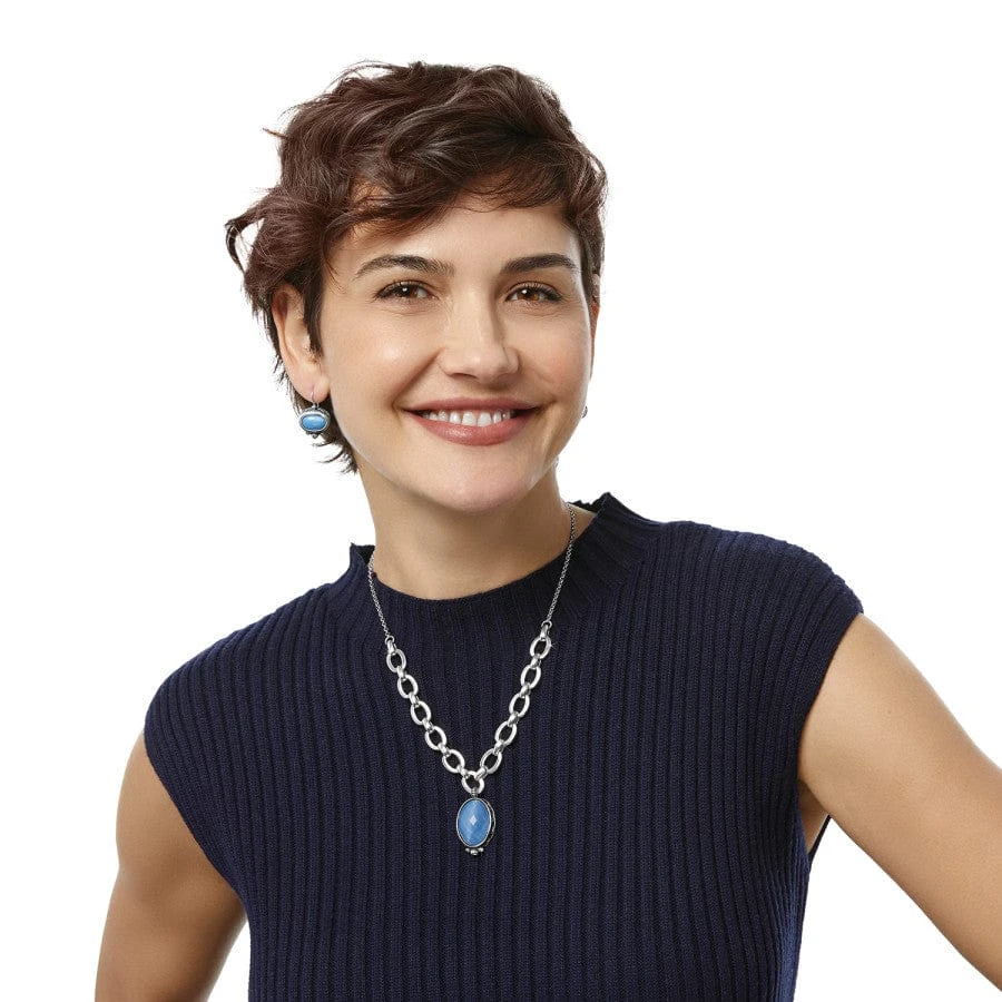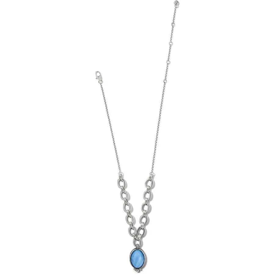 Inspired by the moon, this pendant on a cool chain link has a hand-set stone that is hand-set glass that is handcrafted in Germany and encased in clear gloss for luminosity.