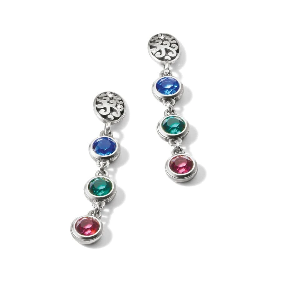 โPointillismโ is the technique of small, distinct dots of color, applied in patterns to form an image. These earrings with translucent crystals in amethyst, aquamarine, emerald and sapphire, along with pierced silver scrolls, are dots that blend together to create a harmony of color and form.