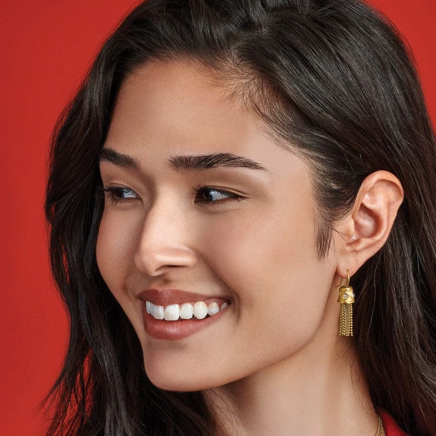 Elegant mini tassel design with Meridian Zenith elements, these earrings feature glass stones – delicate, feminine and modern!